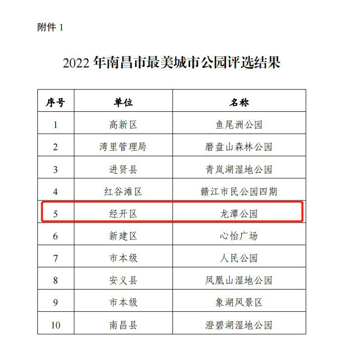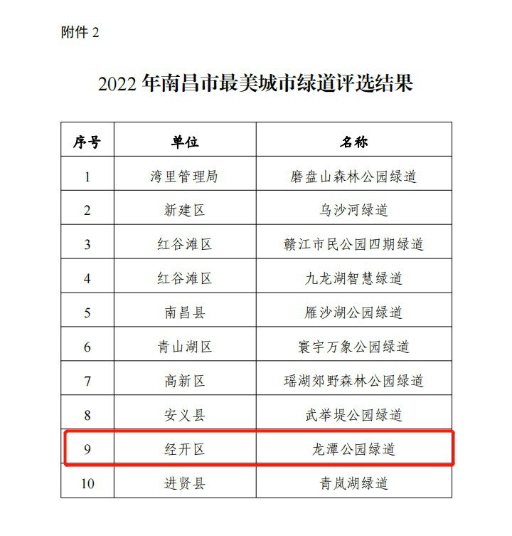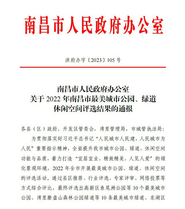 2月28日,南昌市人民政府办公室发布《关于2022年南昌市最美城市公园、绿道休闲空间评选结果的通报》,其中由南昌金开集团建设的龙潭公园(南昌经开区龙潭水渠景观提升改造工程)荣获“最美公园”“最美绿道”荣誉称号!