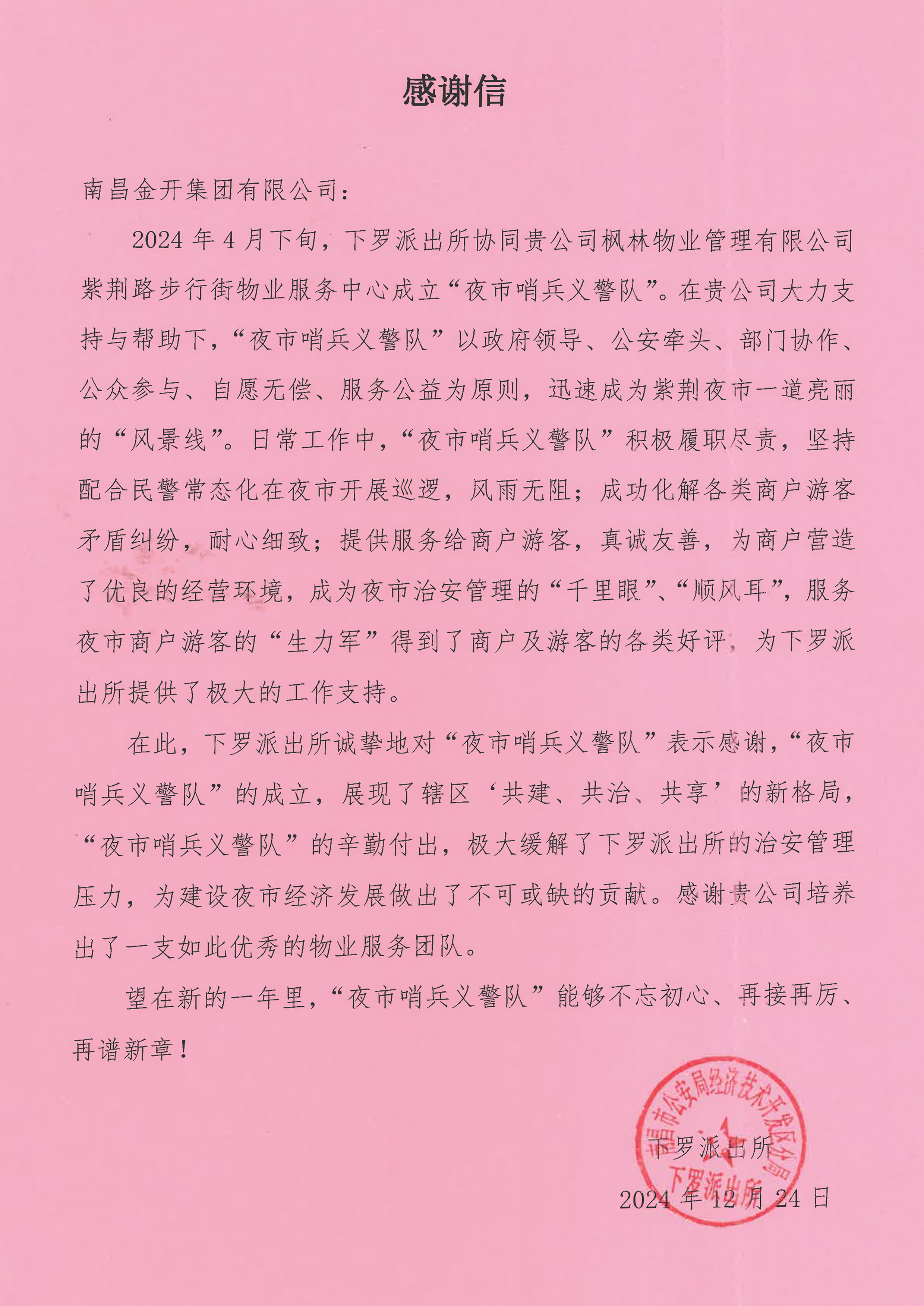 12月24日上午,南昌市公安局经济技术开发区分局下罗派出所送来一封感谢信,对“夜市哨兵义警队”在紫荆夜市治安管理中所付出的辛勤努力和取得的优异成绩表示感谢与肯定。